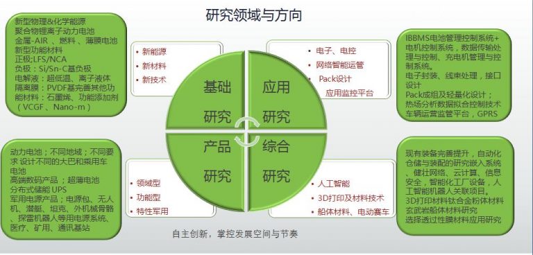 准固态聚合物锂离子动力电池与系统集成、 涂碳集流体开发、相分离多孔电极、LF(M)S 高能正极、Si/Sn-C基负极、固态电解质LLZO 、5V高电压电解液、有机无机半点电解质复合隔离膜、功能添加剂 PETOD、ANL纳米陶瓷粉末、GC合金的合成开发、电池核心装备制备;
